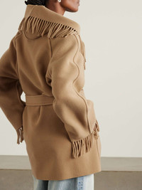 EDITORS'NOTES Balenciaga's jacket is traced with swishy fringing that gives it a cool bohemian feel. It's crafted from soft wool and has a shawl-inspired collar with a hood at the back. Wear yours with relaxed denim and the label's 'La Cagole' bag. SIZE & FIT - 1 = UK 6-8/ US 0-2/ FR 34-36/ IT 38-40 - 2 = UK 10-12/ US 4-6/ FR 38-40/ IT 42-44 - 3 = UK 14-16/ US 10-12/ FR 42-44/ IT 46-48 - Fits true to size, take your normal size - Designed for a loose fit, use the tie belt to cinch in at the waist - Mid-weight, non-stretchy fabric with fringed trim - Model is 175cm/ 5'9" and is wearing the designer's size 1 - Bust: 79cm/ 31" - Waist: 69cm/ 27” - Hip: 81cm/ 32” DETAILS & CARE - Beige wool - Slips on - 100% wool; pocket lining: 100% cupro - Dry clean - Designer color: Praline Beige