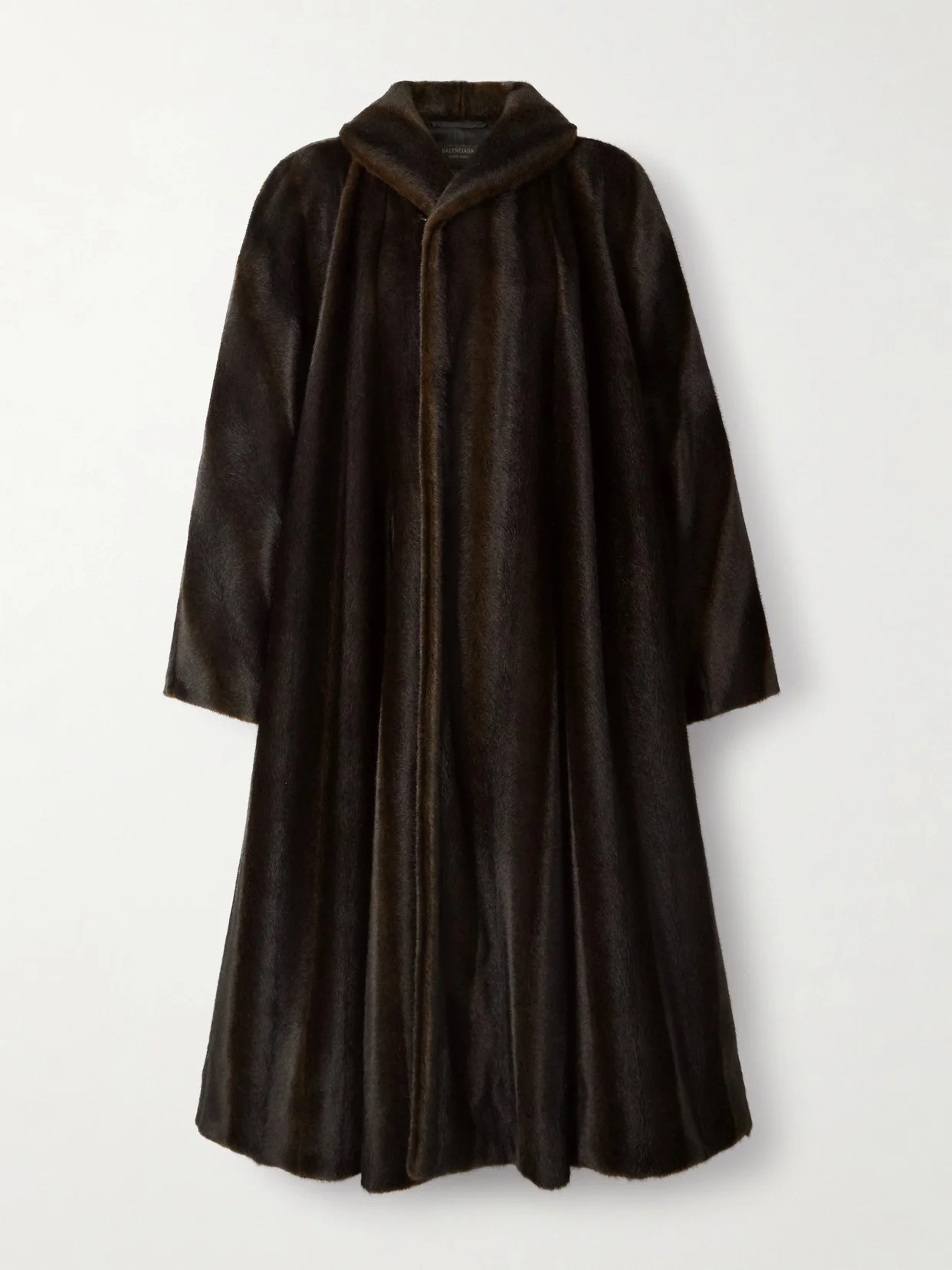 Balenciaga's coat debuted on the label's Fall '25 runway - it was styled solo and cinched by a wide leather belt. Made from plush fabric that looks like fur, it has an enveloping shape with a shawl collar and floor-sweeping hem. Slip your hands into the deep side pockets.