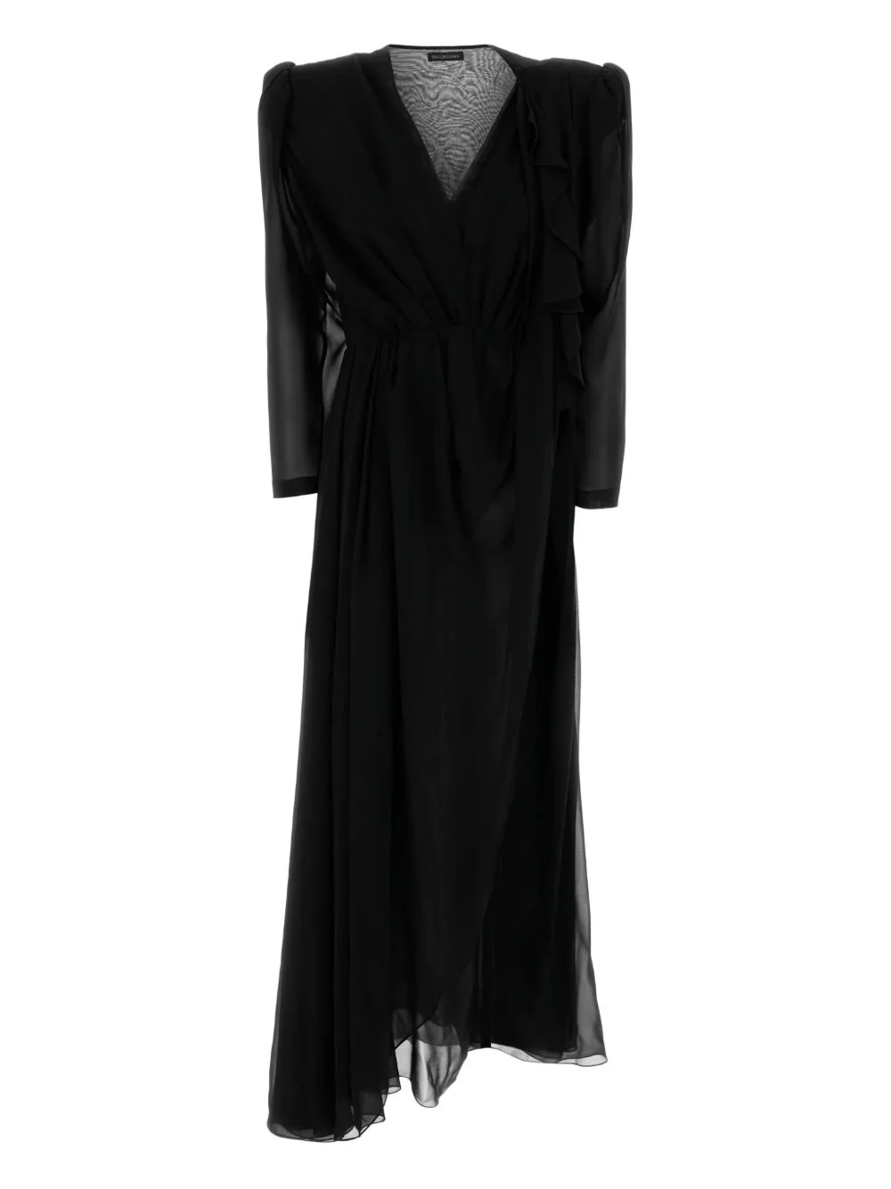 asymmetrical dress Highlights - Black - Silk crepe - Puffed sleeves - Asymmetrical hem - V-neck - Wrap effect Imported Composition Silk 100% Washing instructions Dry Clean Only