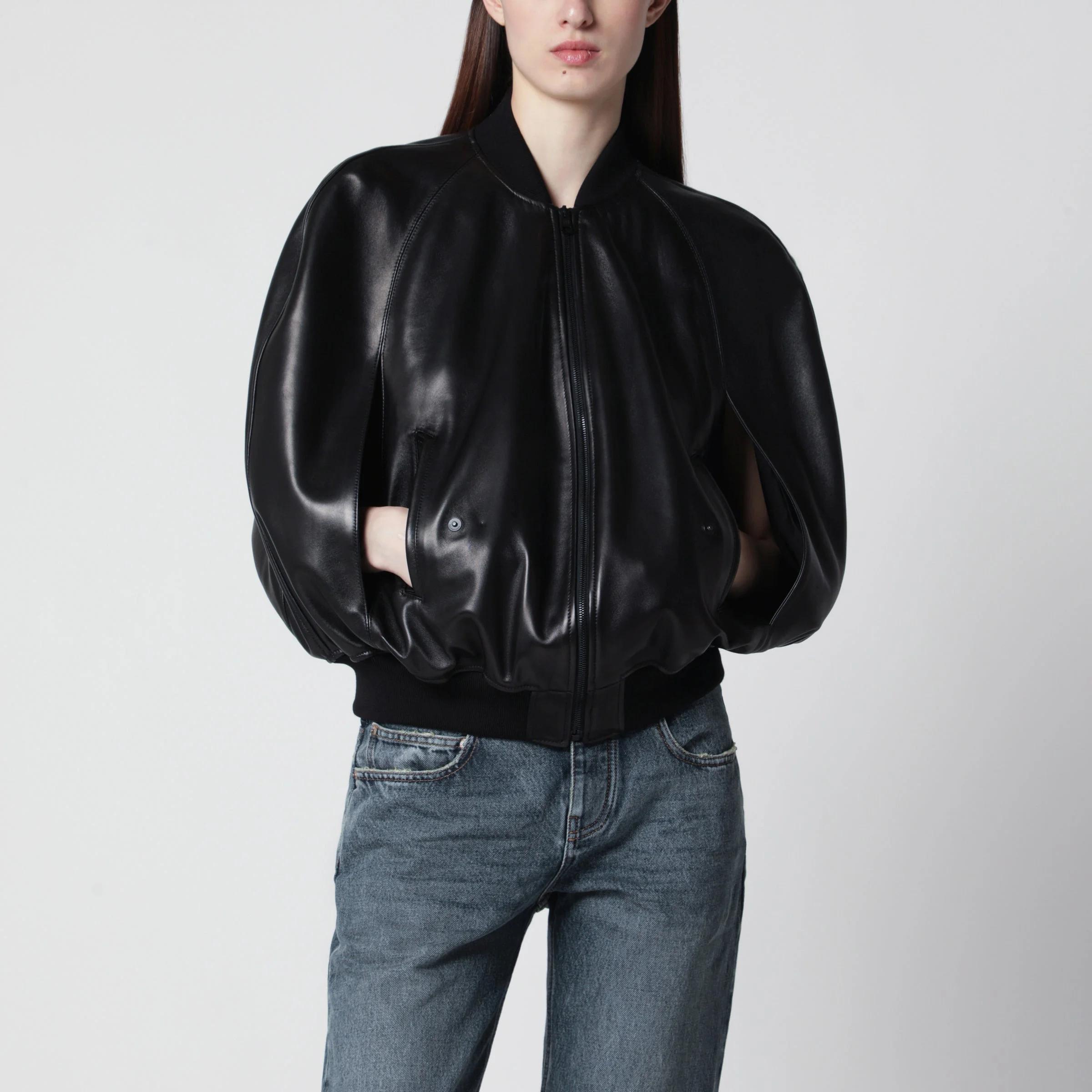 Balenciaga bomber jacket in leather• Color: Black• Front zip closure• Ribbed trims• Two flap pockets on the front• Balloon design with sleeve openings