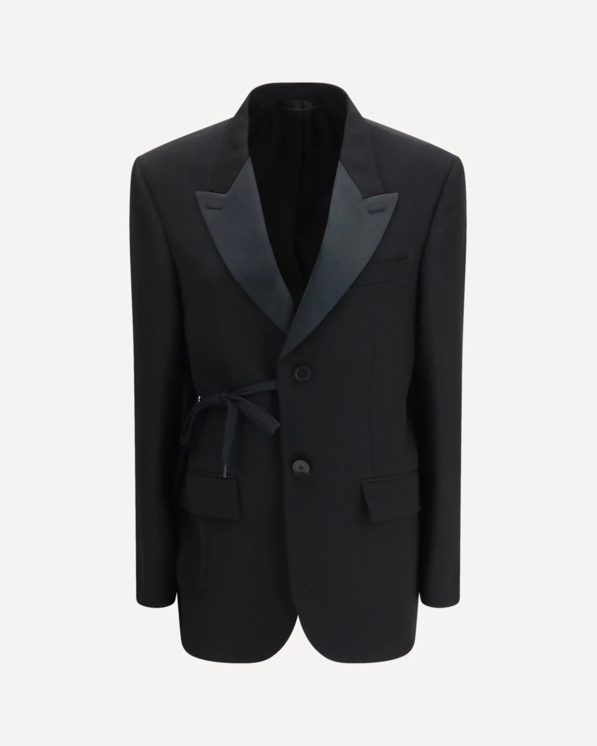 The wrap tailored Jacket by Balenciaga offers a refined reinterpretation of classic tailoring with a modern, sophisticated edge. Crafted from wool, it features a wrap construction with single-breasted front closure and a self-tie drawstring at the waist, subtly shaping the silhouette. The design is completed with classic lapels, a welt chest pocket and two front flap pockets. Long sleeves with buttoned cuffs, a central back vent and a cupro lining ensure comfort and ease of movement. Finished with a regular fit, this jacket embodies Balenciaga’s contemporary tailoring aesthetic. DETAILS - Sku: 857389TNT21_1000 - Season: SS26 - Fit: Regular - Composition: GENERAL 100% Wool - MADE IN ITALY