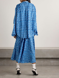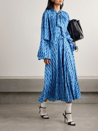 Pussy-bow printed crepe de chine midi shirt dress Azure