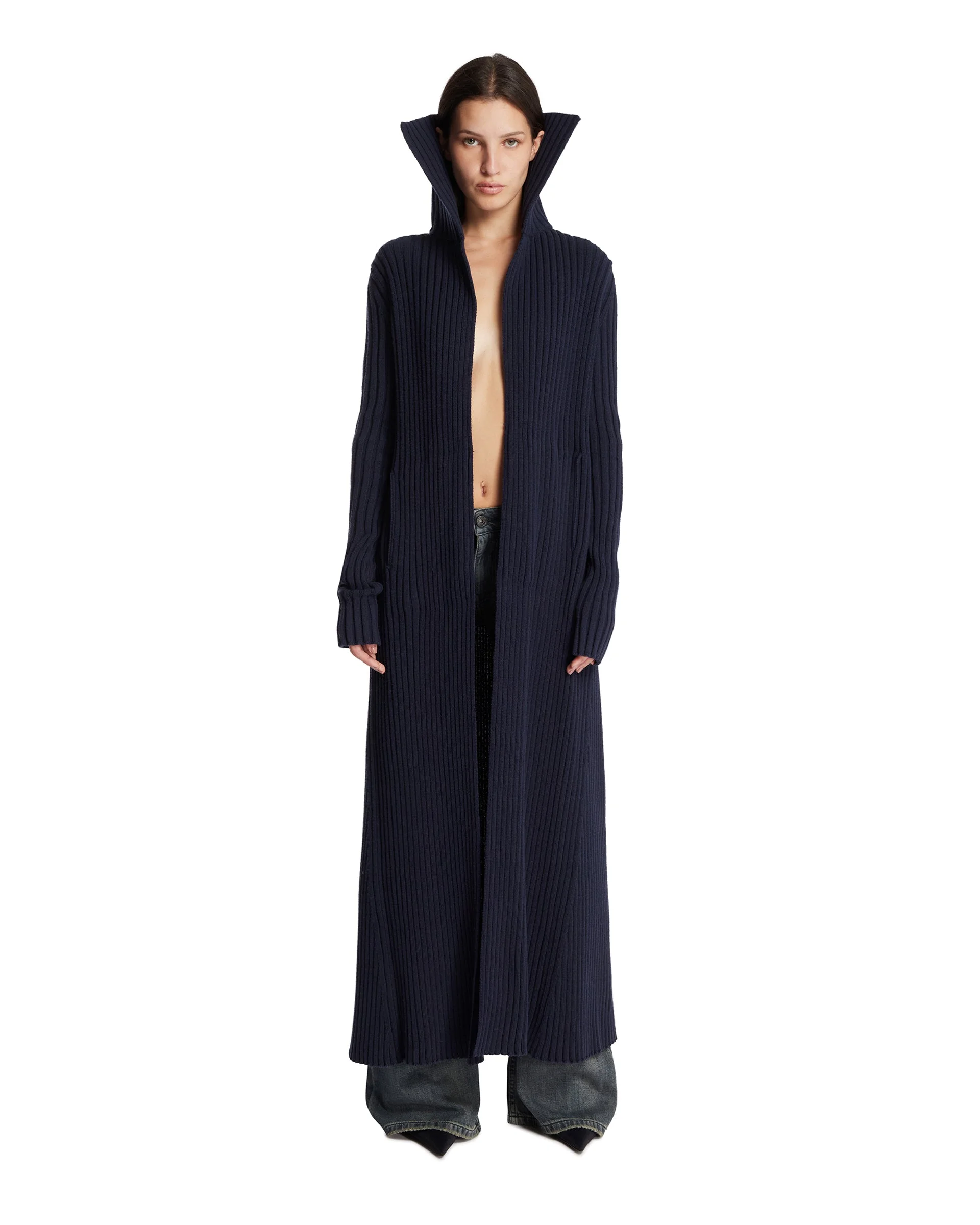 Balenciaga Blue Ribbed Long Cardigan. Blue cotton blend, ribbed knit, long sleeves, stand collar, side pockets. Robe-style design with no closure, regular fit. Laimitri is 177 cm and she is wearing size S. DETAILS Model: 849997T34148806 Composition: 55% Polyester, 46% Cotton Made in: ITALY Season: FW25-26