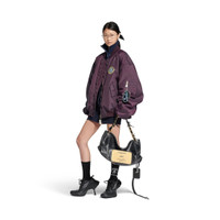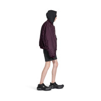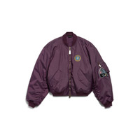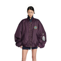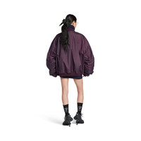 Bomber Jacket Large Fit in eggplant polyamide is from look 27 of Balenciaga Fall 25 Collection. PRODUCT DETAILS • Polyamide • Zipped closure • Tab zipper puller • 2 snap flap pockets at front • Ribbed trims • Uniform Patch at chest • Made in Italy Main material: 100% polyamide