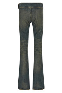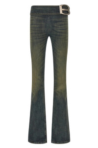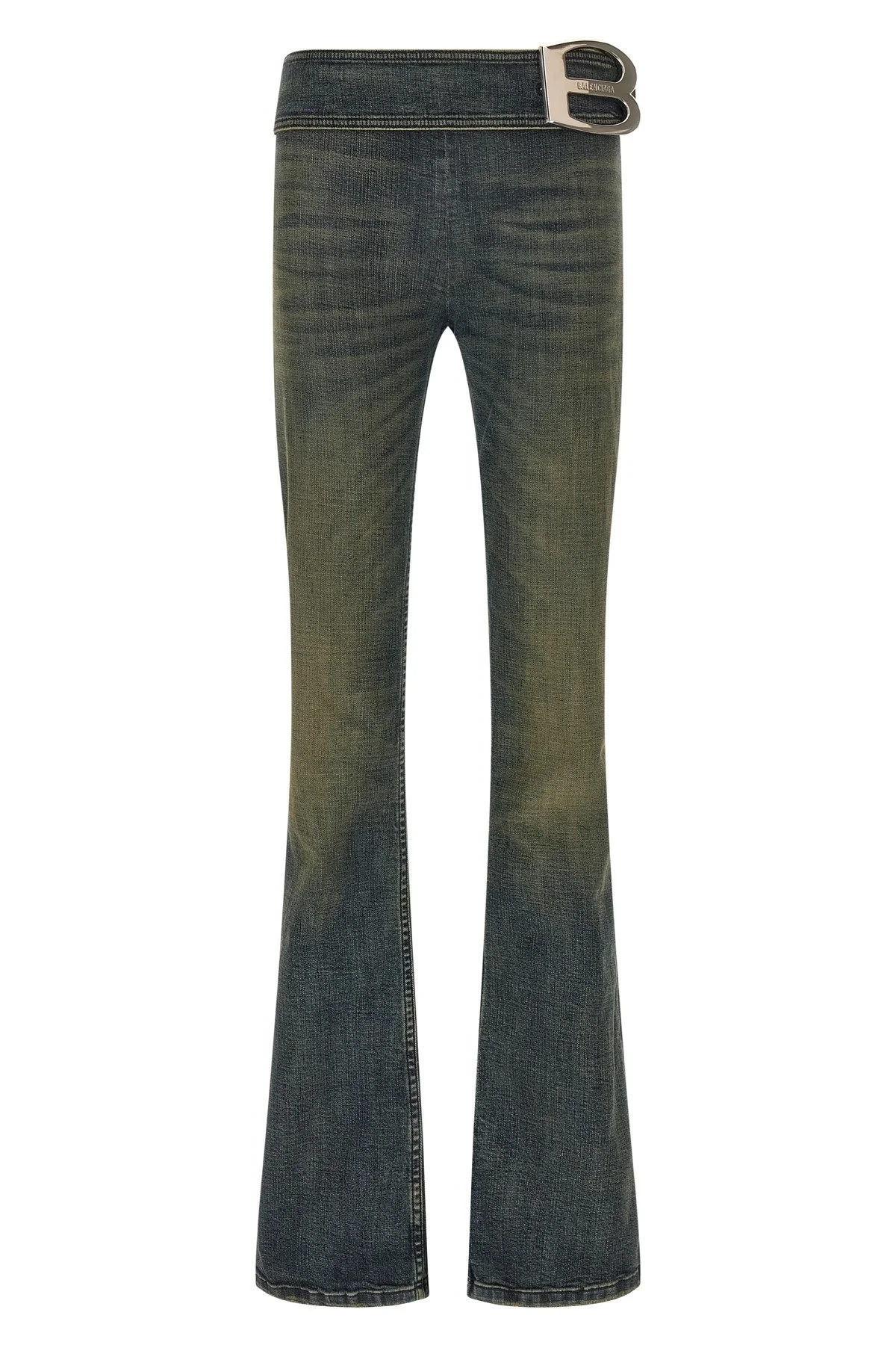 cod. 851346TTW893394 'Bootcut Buckle' stonewashed stretch cotton denim jeans with flared leg, side zip closure, belt with maxi metal logo buckle. Color: Blue Size & Fit: true to size fit Composition: 98% cotton, 2% elastane Made in: Italy