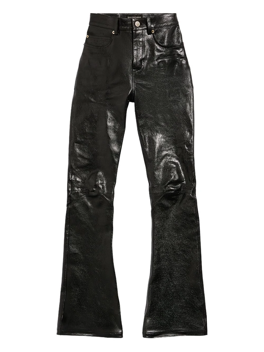 flared leather trousers Balenciaga’s affinity for directional cuts takes centre stage for AW23, as evidenced by these black trousers. They're crafted from leather treated with a lustrous sheen and boast an elongated flared leg. Highlights - Black - Lambskin - High-shine finish - Silver-tone logo lettering - Belt loops - Concealed fly and button fastening - Classic five pockets - Bootcut Made in Italy Composition Lambskin 100% SIZE & FIT Measurement FRONT RISE 10.51 in(26.7 cm) INSIDE LEG 34.48 in(87.6 cm) HIPS 32 in(81.3 cm) WAIST 27 in(68.6 cm) Washing instructions Specialist Cleaning
