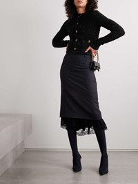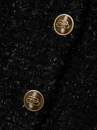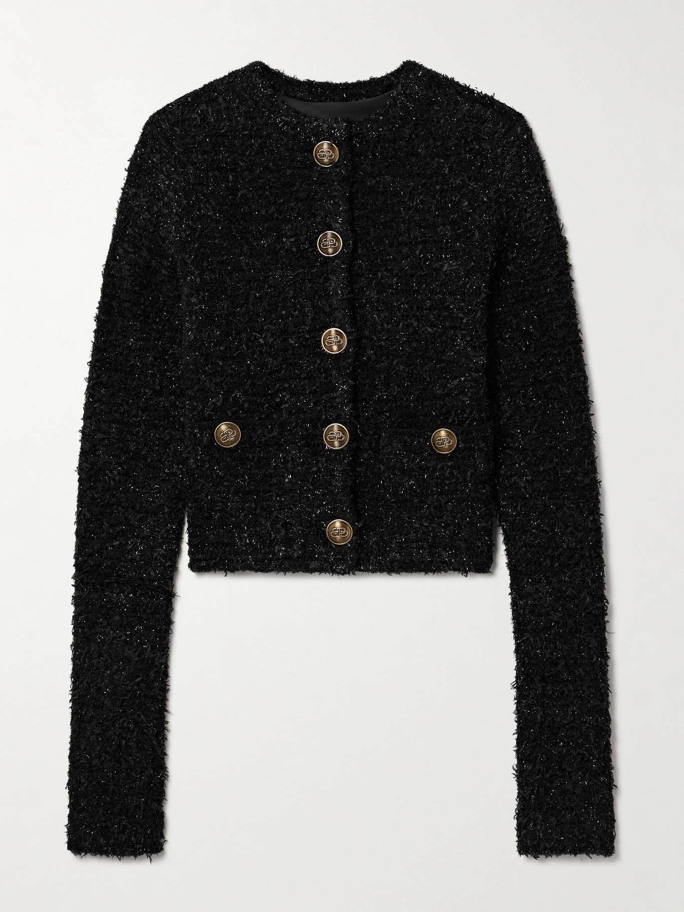 EDITORS'NOTES Balenciaga’s cropped cardigan has been made in Italy from black cotton-blend tweed flecked with sparkling metallic threads. It has a chic, collarless design and is decorated with gold-tone logo-stamped buttons. Wear yours with the matching mini skirt. SIZE & FIT - Fits small to size, take one size larger than normal - Those with a curvy figure may wish to take a further size up - Designed for a close fit - Textured, slightly stretchy fabric - S/M/L sizing DETAILS & CARE - Black cotton-blend tweed - Button fastenings through front - 73% cotton, 24% polyamide, 2% viscose, 1% elastane; trim: 77% cotton, 19% polyamide, 3% viscose, 1% elastane; lining: 87% polyester, 13% elastane - Dry clean Small to size. See Size & Fit notes.