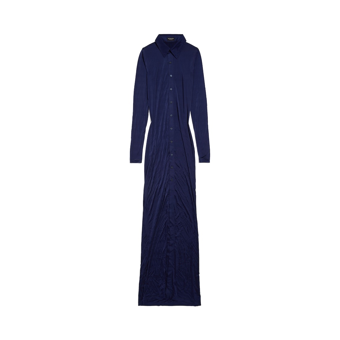 Stretch Maxi Dress in marine blue fluid jersey is from look 46 of Balenciaga Spring 25 Collection. PRODUCT DETAILS • Fluid jersey • Fitted • Button-down shirt collar • 13 button front • Opened at bottom • Long sleeves • Maxi length • Made in Italy Main material: 92% viscose, 8% elastane