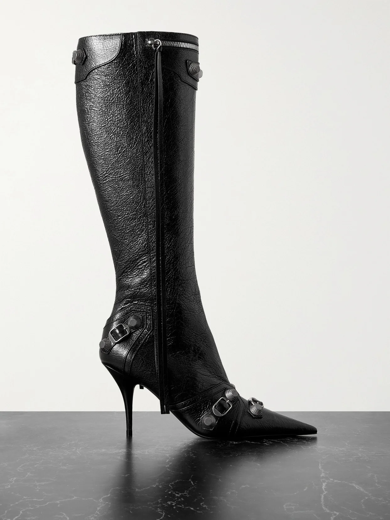 Balenciaga's 'Cagole' knee boots are embellished with the hardware usually seen on the label's bag of the same name. They're crafted from glossy textured-leather in a sleek point-toe shape and poised on slim stiletto heels. Wear yours with a mini dress for high-octane glamour.