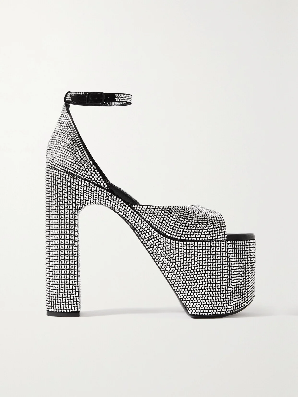 Defined by their stratospheric height, Balenciaga's 'Camden' sandals are set on a 160mm block heel and a chunky platform for balance. They've been made in Italy from smooth black leather and are embellished with scores of shimmering crystals.