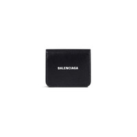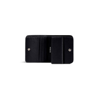 Cash Flap Coin And Card Holder in black grained calfskin PRODUCT DETAILS • Dimensions : L3,9 x H3,5 x W0,9 inch • Grained calfskin • Rounded edges • Snapped closure • 1 bill pocket • 4 business and credit card slots • 1 snapped coin purse • Printed logo • Made in Italy • Wipe with a soft cloth Material: 100% calfskin