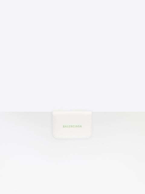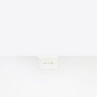 Cash Mini Wallet in white grained calfskin and light green logo PRODUCT DETAILS Dimensions: W 3.7 inches H 2.7 inches D 1.6 inches Composition: 100% Calfskin - - Grained calfskin - 1 snapped bill pocket - 3 card slots - 1 snapped coin purse - Front light green printed logo - Made in Italy - Wipe with a soft cloth - The item comes with a Balenciaga dustbag and box