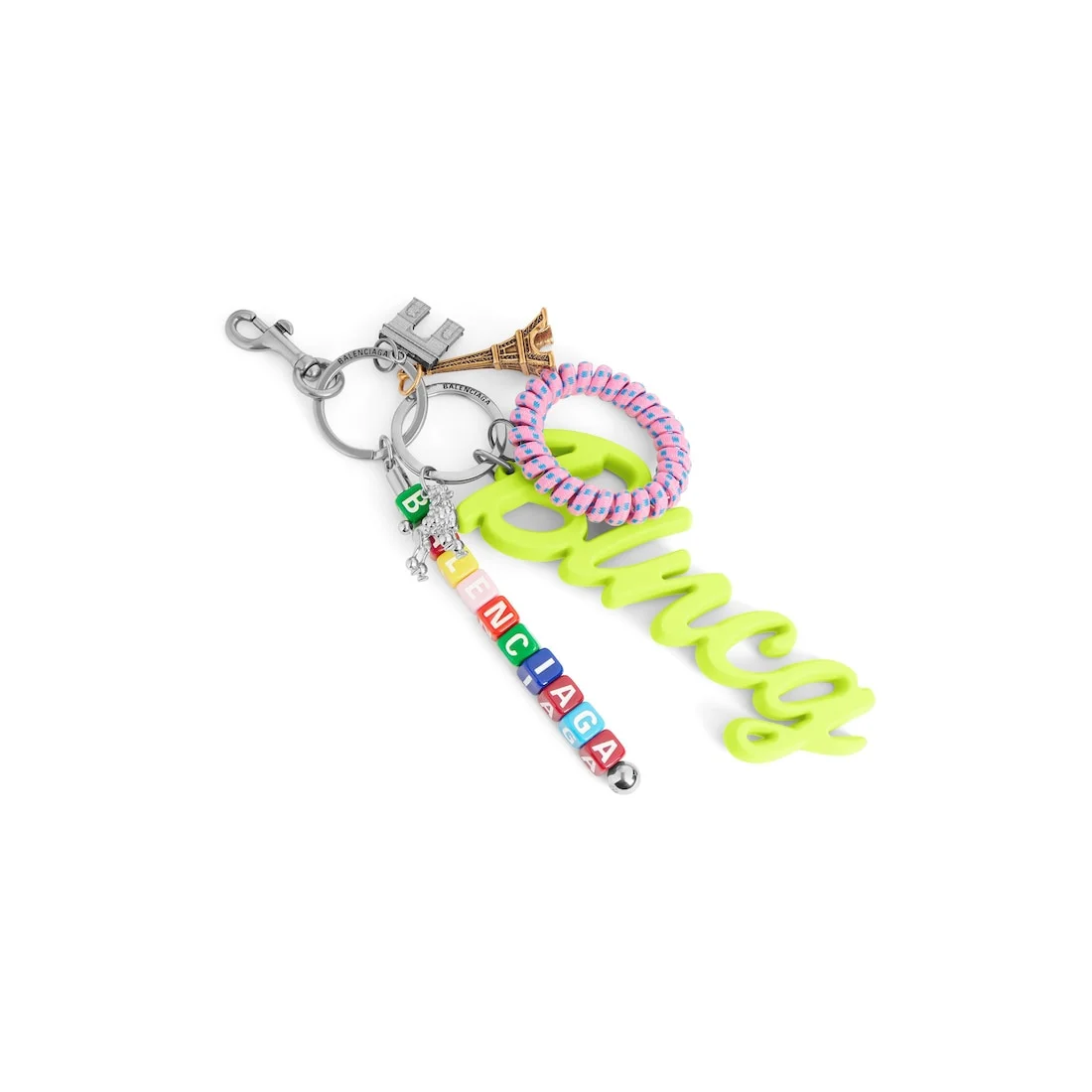 Charm/Keychain BLNCG in multicolor brass, silicone, zamak and stainless steel PRODUCT DETAILS • Dimensions: L3,5 x H0,6 x W0,4 inch • Brass, silicone, zamak and stainless steel • Keychain with charms • 1 snapped hook • Aged-silver hardware • BB and Balenciaga logos engraved • Can be attached to the bag or be used as a keychain • Made in Italy Material: brass, silicone, zamak, stainless steel