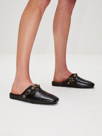 Balenciaga brings new ease to footwear thanks to this slip-on mule. The Cosy Cagole Mule features their signature stud hardware in antique gold for a pretty contrast against the lustrous lambskin. Tonal soles and a subtle embossed signature at the heel complete the sleek pair. Designer Founded by Cristobal Balenciaga in 1917, the Balenciaga House is defined by a worldwide recognition as a leader in major fashion trends due to its creativity, masterful cuts and exquisite techniques. Since October 2015, Demna Gvasalia, appointed artistic director of Balenciaga's collections, continues to uphold the vision, influence and radical style of the House. Details - Made in Italy - 100% Lambskin - Wipe with a Soft Cloth - Tapered Square Toe - Aged-Gold Studs and Buckles on the Upper - Debossed Balenciaga Sole - Tonal Sole and Insole - Slip-On Style - True to Size - Item # 1-152536