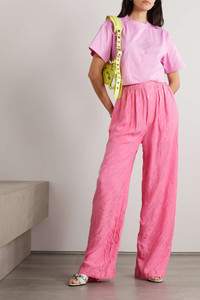 EDITORS'NOTES Balenciaga's pants are modeled on pajama styles and made from soft pink silk. They're jacquard-woven with tonal versions of the house moniker and have a crinkled finish. Tuck a blouse into the waistband to offset the floaty legs. SIZE & FIT - Fits true to size, take your normal size - Pants measure high rise, however intended fit is to be worn loose and low on the hips - Lightweight, non-stretchy fabric - Model is 180cm/ 5’11” and is wearing a FR 36 DETAILS & CARE - Pink crinkled silk-jacquard - Concealed button fastenings along front - 100% silk - Dry clean