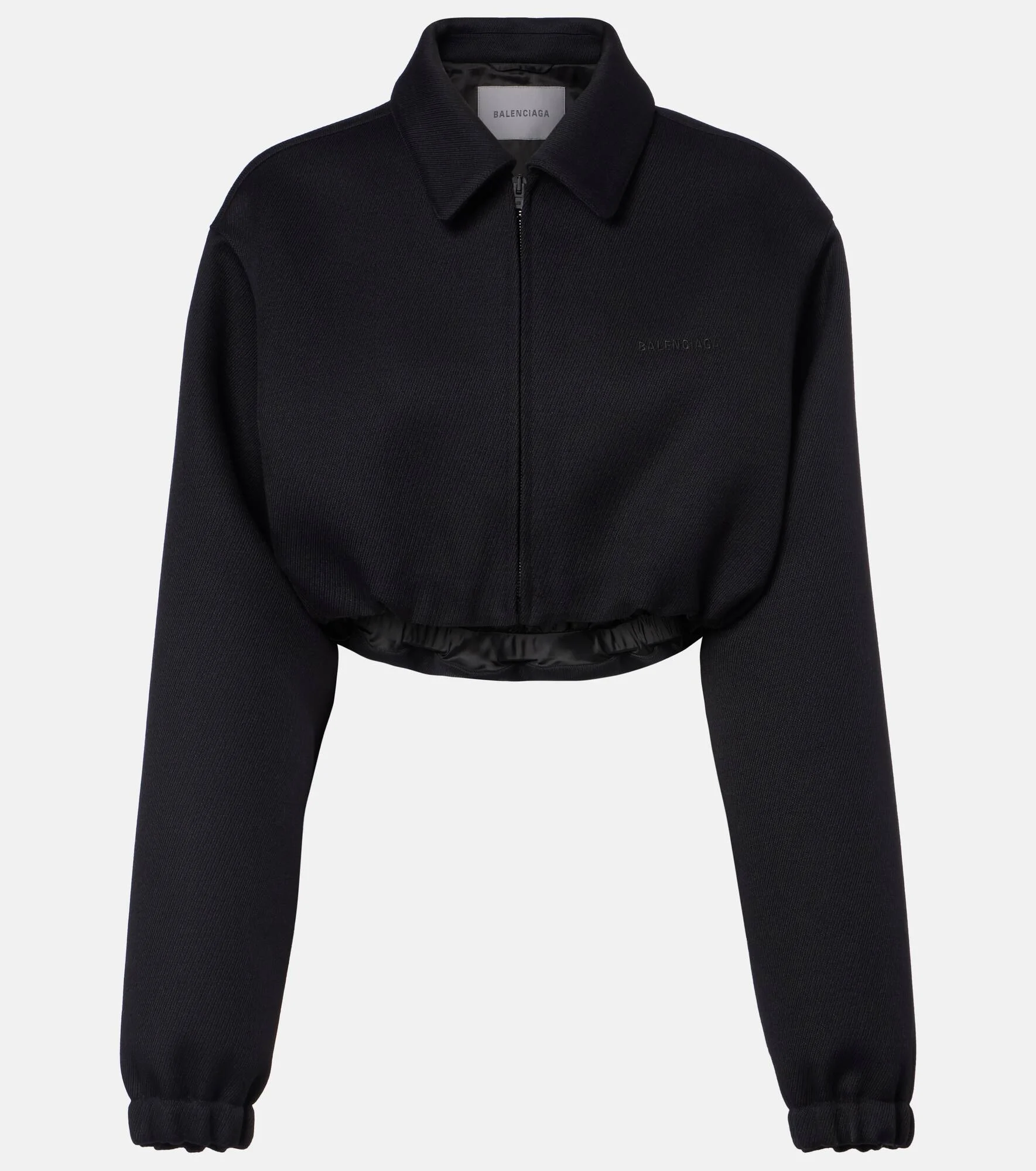 Innovation is at the heart of Balenciaga, which proudly presents its modern interpretation of fashion in every piece. This bomber jacket features a shirt collar and a cropped silhouette. Product Details - Material: 100% wool - Care instructions: dry clean - Made in Italy - Color: black - Designer color name: Black - Lining: 100% viscose - Embroidery: 100% polyester - Closure: zipped front - Cuff: elasticated - Item number: P01158840 Size & Fit - True to size - Dropped shoulders - Cinched waist - Elasticated hem - Non-stretchy fabric - Height of model is 180cm-71" and wears a size FR 36