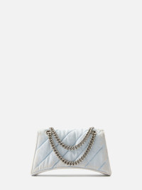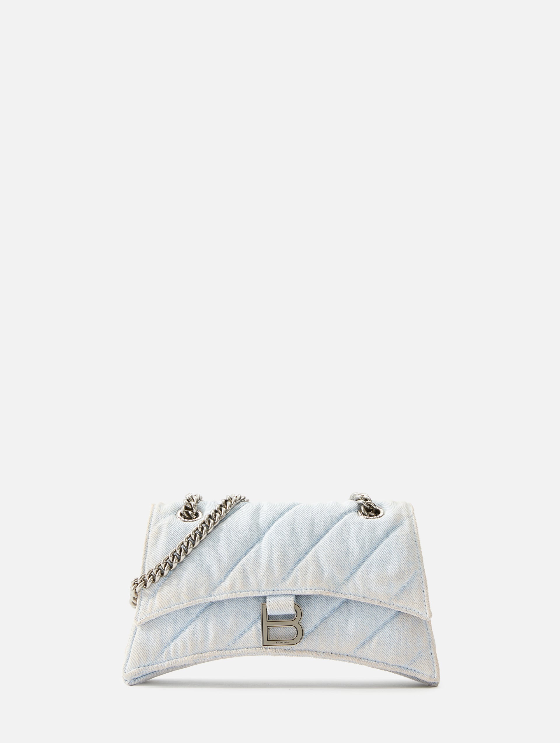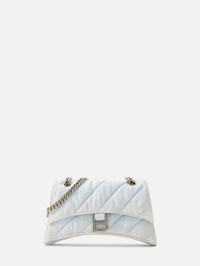 Crush on this. Balenciaga's metallic Crush Chain Bag is a new iteration on their celebrated curvilinear design, complete with tonal B logo hardware and shoulder and crossbody chain. Crafted in a contemporary crushed quilted denim. Details 100% cotton Washed denim and quilted Chain bag Curvilinear base Age-silver hardware Studded magnet closure 3 compartments 1 inner zipped pocket 1 inner flat pocket Nappa lambskin lining L 9.8 x H 5.9 x W 3.1 in Chain strap: 19.6 in Made in Italy Item # 1-158715 Designer