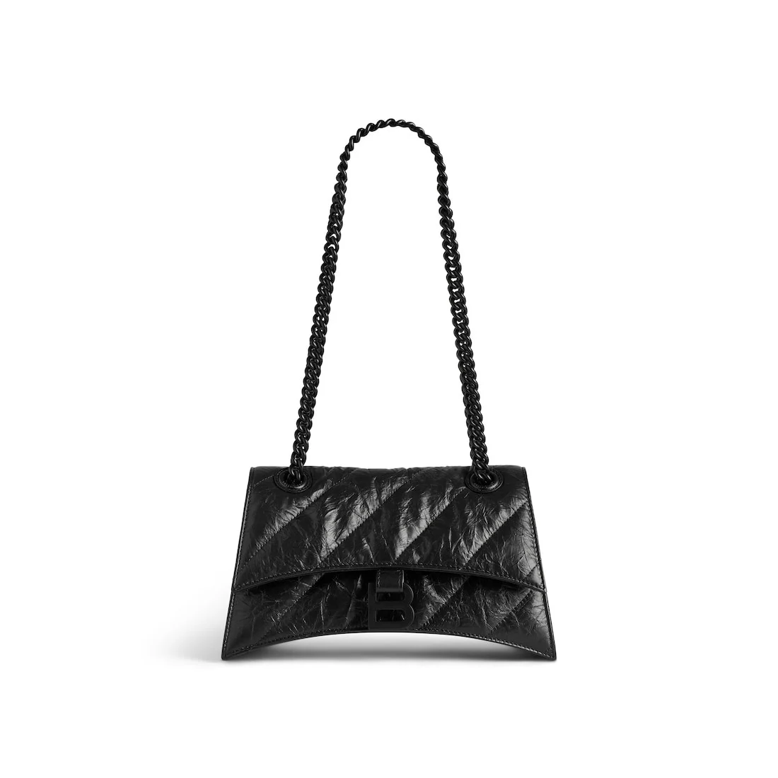 Crush Small Chain Bag Quilted in black crushed calfskin, black matte hardware PRODUCT DETAILS • Dimensions : L9,8 x H5,9 x W3,1 inch • Crushed calfskin and quilted • Chain bag • Curvilinear base • Shoulder and crossbody chain strap (19,6 inch) • Black matte B logo hardware • Studded magnet closure • 3 compartments • 1 inner zipped pocket • 1 inner flat pocket • Nappa lambskin lining • Made in Italy • Wipe with a soft cloth Material: 100% calfskin