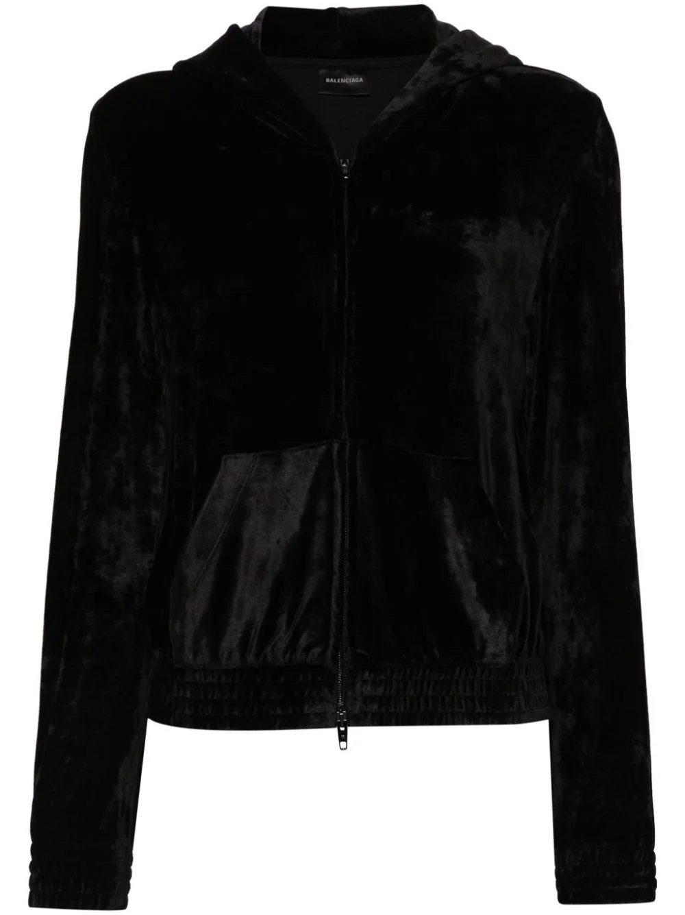 BB Paris hoodie Highlights - Black - Stretch-design - Velvet - Slouchy hood - Long sleeves - Elasticated cuffs - Two front pouch pockets - Crystal embellished bb paris logo at the back - Unlined - Elasticated waistband - Front two-way zip fastening Imported Composition Viscose 79%, Polyamide 19%, Spandex/Elastane 2% SIZE & FIT Model measurements Height 5 ft 10 in(1.77 m) Bust/Chest 32.28 in(82 cm) Hips 35.03 in(89 cm) Waist 25.19 in(64 cm) FittingInformation Designed for a relaxed fit, this piece allows for comfort and movement when worn The elasticated waist allows for a comfortable fit Made from a midweight stretch fabric, this piece offers elasticity and flexibility when worn This piece fits true to size – take your usual size Measurement SLEEVE LENGTH 22 in(55.9 cm) LENGTH 19.48 in(49.5 cm) WAIST 32 in(81.3 cm) BUST 39.01 in(99.1 cm) Washing instructions Dry Clean Only