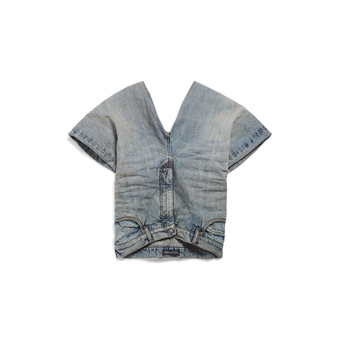 Denim Pants Top in light blue Italian ring cotton is from look 44 of Balenciaga Winter 24 Collection. PRODUCT DETAILS • Italian ring cotton denim • V-neck • Short sleeves • Trompe l'œil construction: Pants become a top • Pants details: button, rivets, belt loops at bottom, lapel, pockets, folded legs at back • Made in Italy 100% cotton