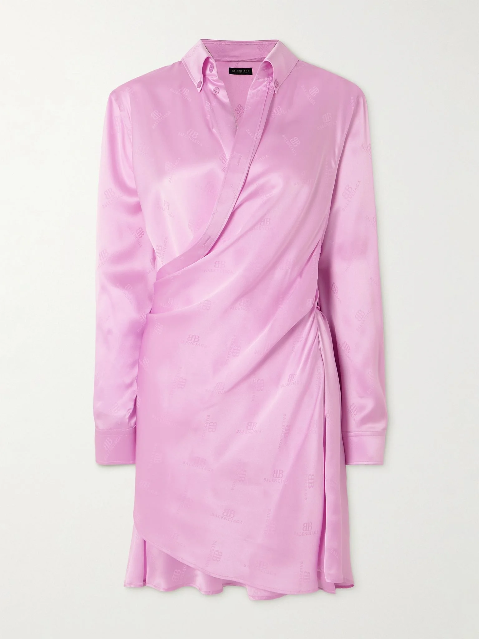 Under the right light, Balenciaga's name flashes in stripes across this mini dress. It's made from logo-woven jacquard silk in a draped wrap silhouette. The beaming pink is a real mood-lifter. Details & Care - Pink silk - Partially concealed button fastenings along front - 100% silk - Dry clean