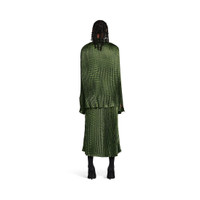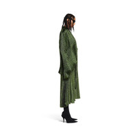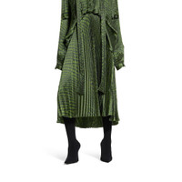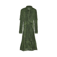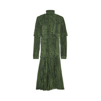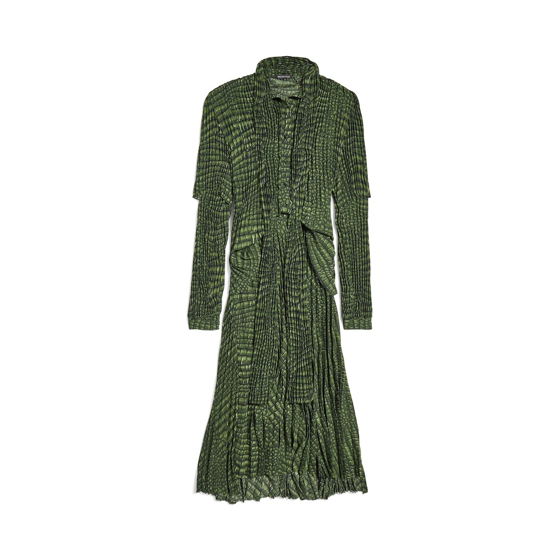 Double Sleeve Pleated Dress in green AI Croc technical crepe is fromlook 22 of Balenciaga Spring 25 Collection. PRODUCT DETAILS • Technical crepe AI Croc printed • Pleated • Two long panels at collar to tie like a Lavaliere or let hang down • Tone-on-tone covered buttons on blouse part • Long double sleeves, 2 wearing options • Trompe l'oeil volume at back: visible blouse bottom, cinched at the waist at front • Ankle-length • Made in Italy Main material: 100% polyester