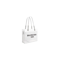 Duty Free Medium Tote Bag in white and black mesh, aged-silver hardware PRODUCT DETAILS • Dimensions: L13,7 x H10,6 x W5,5 inch • Handle drop: 9,8 inch • Mesh • Tote bag • Two handles • Balenciaga Paris logo printed at front • Aged-silver hardware • Open top • Inner detachable zipped pouch • Reinforced bottom panel with brass feet • Made in Italy • Wipe with a soft cloth Material: 95% polyester, 5% lambskin