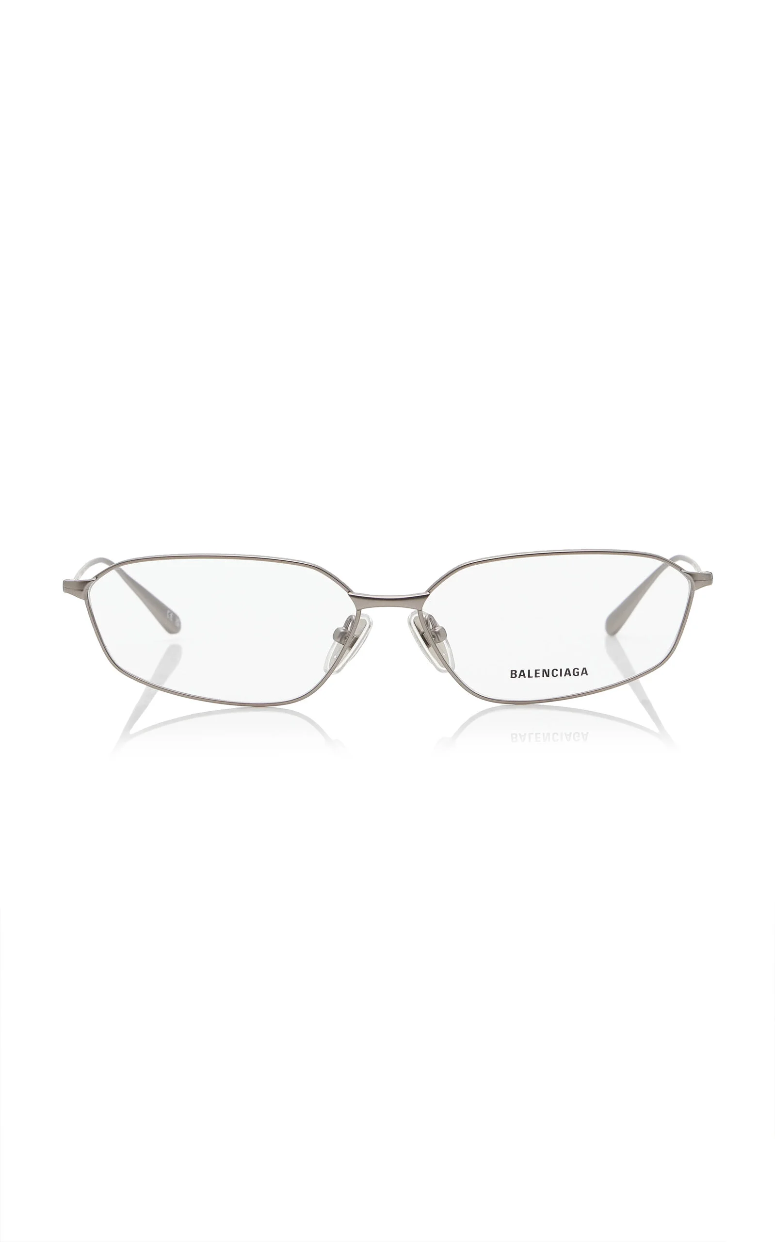 Renowned for their sleek, fluid lines and statement-making garnishes, Balenciaga’s meticulously crafted accessories always have the right amount of edge. The 'Editorial' eyeglasses have oval frames made from matte silver metal set with bio-nylon lenses. PRODUCT DETAILS - Composition: metal - Made in Japan SIZE & FIT - Temple length: 5,71 inch - Bridge length: 0,56 inch