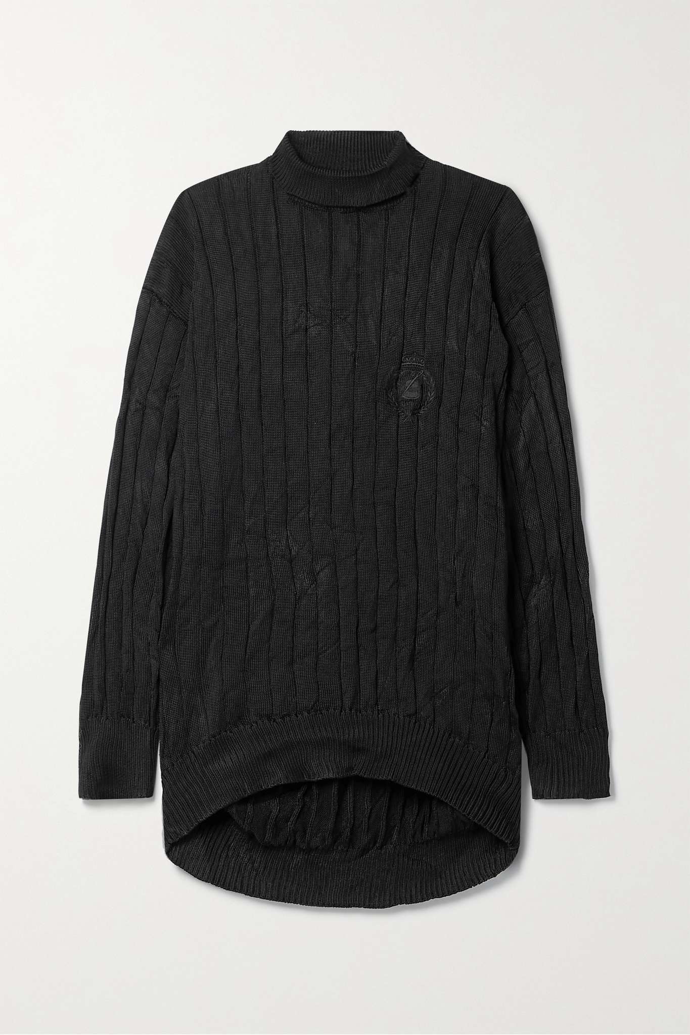 EDITORS'NOTES Balenciaga's sweater is made from black ribbed silk that's intentionally crinkled for cool, nonchalance. It's designed in a loose silhouette with dropped shoulders and a turtleneck and has a collegiate-inspired crest embroidered at the chest - a closer look reveals the thimble, needle and thread at the center of the motif. SIZE & FIT - 1 = 5'3" (160cm) - 2 = 5'5” (165cm) - 3 = 5'7" (170cm) - 4 = 5'9" (175cm) - Fits true to size, take your normal size - Designed for a loose fit - Mid-weight knit - Model is 177cm/ 5'10" and is wearing the designer's size 1 DETAILS & CARE - Black silk - Slips on - 100% silk; trim: 100% polyester - Hand wash