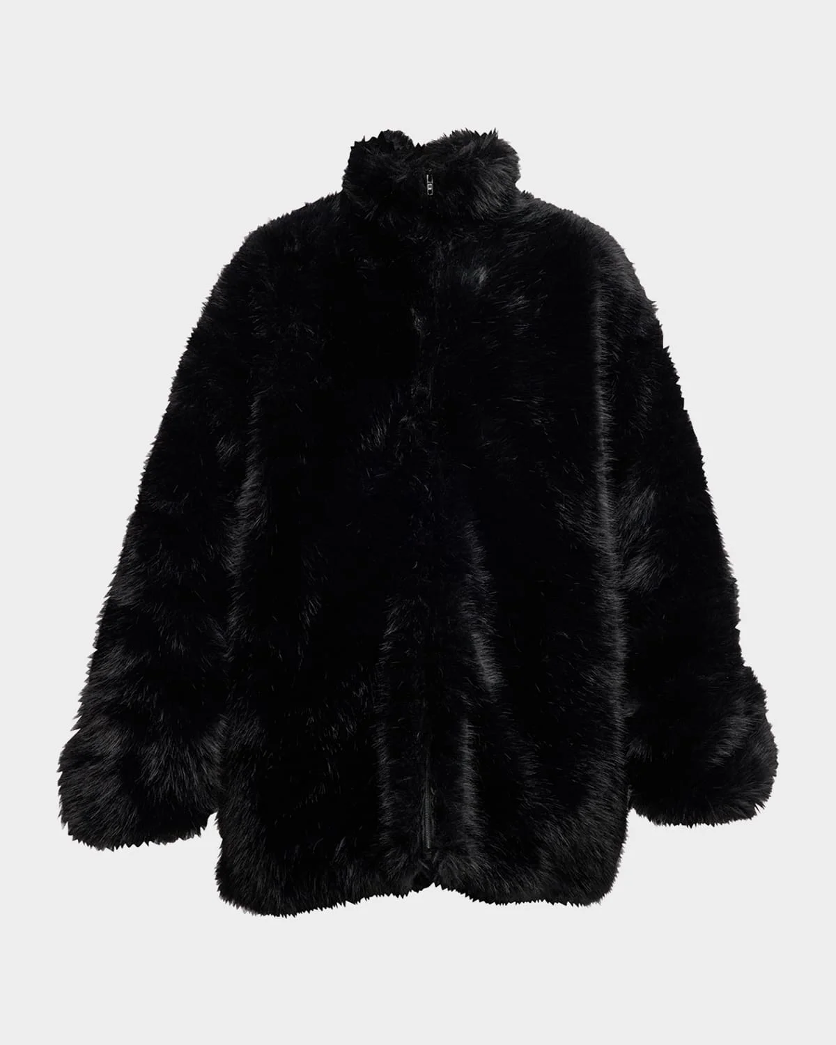 Balenciaga jacket in faux fur (polyester) High stand-up collar Zip front & nbsp; Long sleeves & nbsp; 2 zipped slash pockets Gathered at cuffs Drawstring hem Large fit Extended BB Balenciaga logo painted at back Made in Italy Dry cleaning