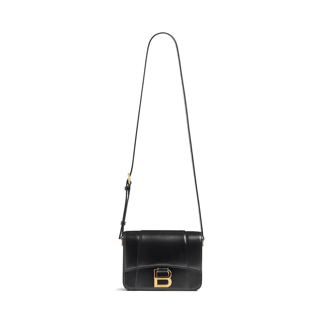 Hourglass Small Flap Bag in black shiny box calfskin, shiny gold hardware PRODUCT DETAILS • Dimensions: L7,4 x H5,5 x W2,7 inch • Shiny box calfskin • Flap bag • Adjustable crossbody strap (drop: 21,6 inch) • Shiny gold B logo hardware • Studded magnet closure • 1 main compartment • 3 inner card slots • 1 inner flat pocket • 1 flat pocket on the back • Nappa lambskin lining • Made in Italy Material: calfskin