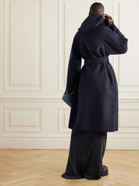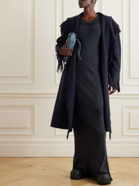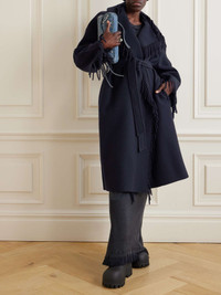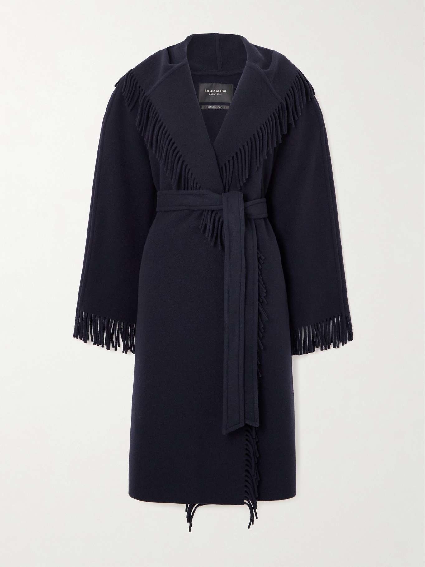 EDITORS'NOTES Balenciaga's coat is traced with fringe that gives the classic design an unexpected Western element. Made from brushed wool for a soft handle, it has a generous hood and self-tie belt to secure it closed and cinch the waist. Layer it over a maxi dress or tailoring. SIZE & FIT - 1 = UK 6-8/ US 0-2/ FR 34-36/ IT 38-40 - 2 = UK 10-12/ US 4-6/ FR 38-40/ IT 42-44 - 3 = UK 14-16/ US 10-12/ FR 42-44/ IT 46-48 - Fits true to size, take your normal size - Designed for a loose fit, use the tie belt to cinch in at the waist - Mid-weight, non-stretchy fabric - Model is 177cm/ 5'10" and is wearing the designer's size 1 - Bust: 79cm/ 31" - Waist: 61cm/ 24" - Hip: 89cm/ 35" DETAILS & CARE - Navy wool - Ties at front - 100% wool; lining: 100% cupro - Dry clean
