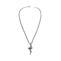 Goth Snake Necklace in antique silver recycled brass with rhinestones PRODUCT DETAILS • Dimensions: L20,28 x H11,82 x W0,48 inch • Recycled brass and glass • Necklace • Sword pendant with intertwined snake with BB logo • White rhinestones in place of the eyes • Adjustable chain • Clasp closure • Made in Italy • This item is nickel-free, lead-free, and hypoallergenic Material: brass, glass