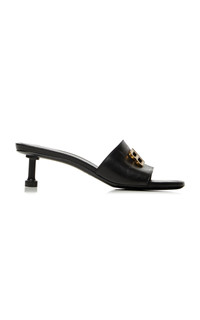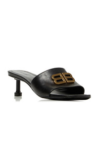 Experimental and minimalistic by design, Balenciaga is also renowned for its uncompromising standard and avant-garde creativity. With Creative Director Georgian designer Demna Gvasalia at its helm, the brand continues to live and breathe Balenciaga’s inherent elegance, balanced with the designer’s edgy, urban aesthetic. The 'Groupie' sandals have a simple slip-on silhouette made from soft sheepskin leather topped with the house's antiqued brass 'BB' logo. The sculptural midi heel adds just the right amount of height. PRODUCT DETAILS - Heel measures approximately 50mm/ 2" - Slip on - Composition: sheepskin leather - Made in Italy