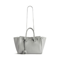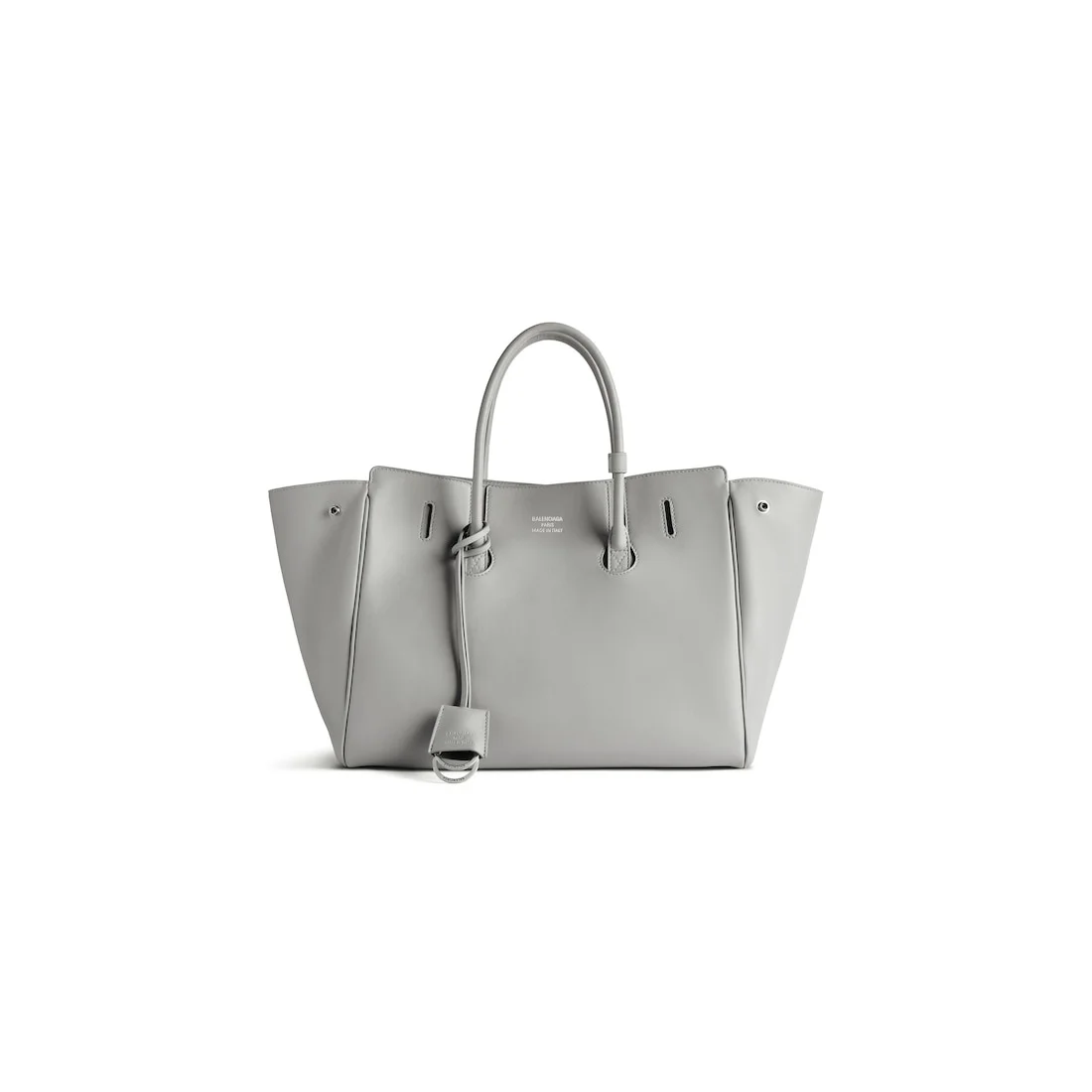 Hampton Small Carry All Bag in Balenciaga grey smooth calfskin, aged-silver hardware PRODUCT DETAILS • Dimensions: L12,2 x H10 x W6,3 inch • Smooth calfskin • Carry all • Two handles with one handle clip (drop: 4,7 inch) • Removable and adjustable shoulder strap (drop: 20,5 inch) • Shoulder, crossbody and hand carry • Balenciaga Paris logo debossed with foil at front • Removable cloche cles with two split rings • Aged-silver hardware • Side snaps • Magnet closure • 1 main compartment • 1 inner zipped pocket • 2 inner flat pockets • 4 brass feet • Nappa lambskin bonded lining • Made in Italy Material: calfskin