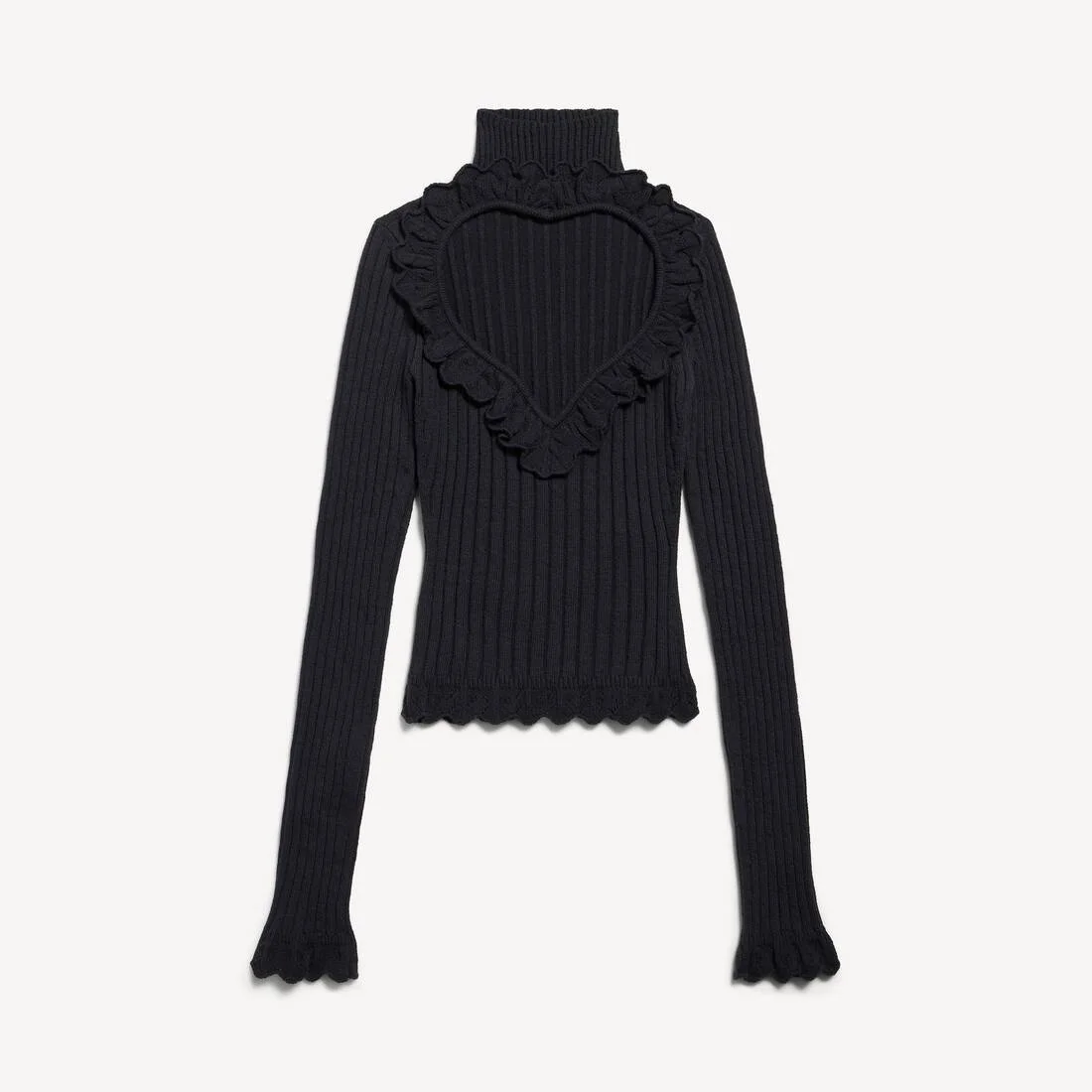 Heart Top in black ribs cotton blend knit PRODUCT DETAILS • Cotton blend knit • Turtleneck • Heart-shaped cut-out at neckline • Embroidered ruffles at neck, cuffs and hem • Made in Italy Main material: 76% cotton, 23% polyamide, 1% elastane
