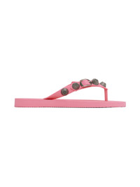 Rubber flip flops in pink. · Open toe · Studded thong-style strap at vamp · Logo stamp at footbed · Treaded sole Supplier color: Light pink/Silver