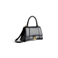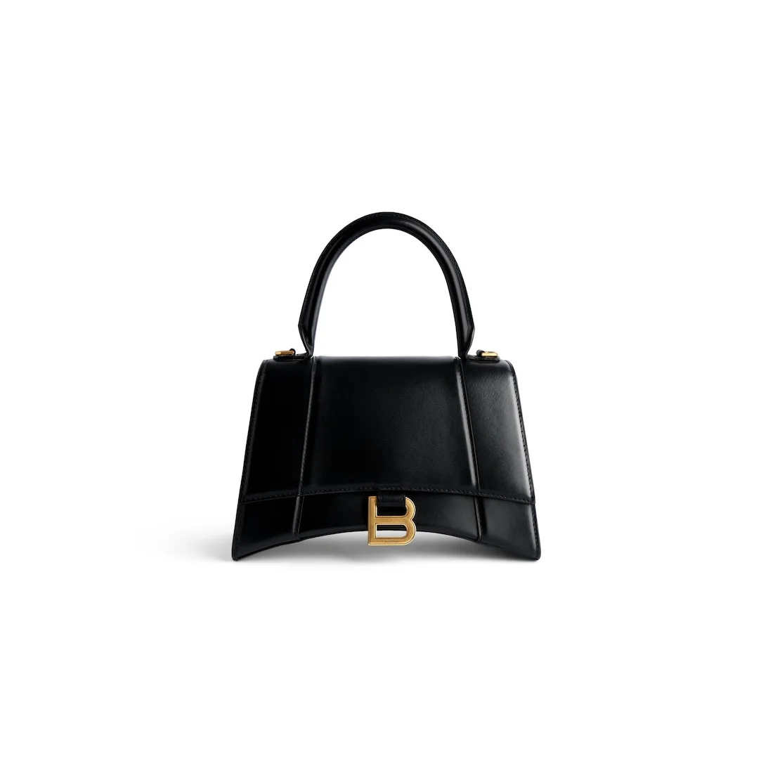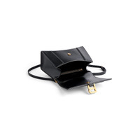 Hourglass Small Handbag in black shiny box calfskin PRODUCT DETAILS • Dimensions : L9 x H5,5 x W3,9 inch • Shiny box calfskin • Hourglass shape • Curvilinear base • Long flap • Adjustable and removable crossbody strap (21,6 inch) • 1 handle • Magnet closure with aged-gold B logo (brass) • 1 back pocket • 1 inner patch pocket • 1 inner zipped pocket • Nappa lambskin lining • Made in Italy • Wipe with a soft cloth Material: 100% calfskin
