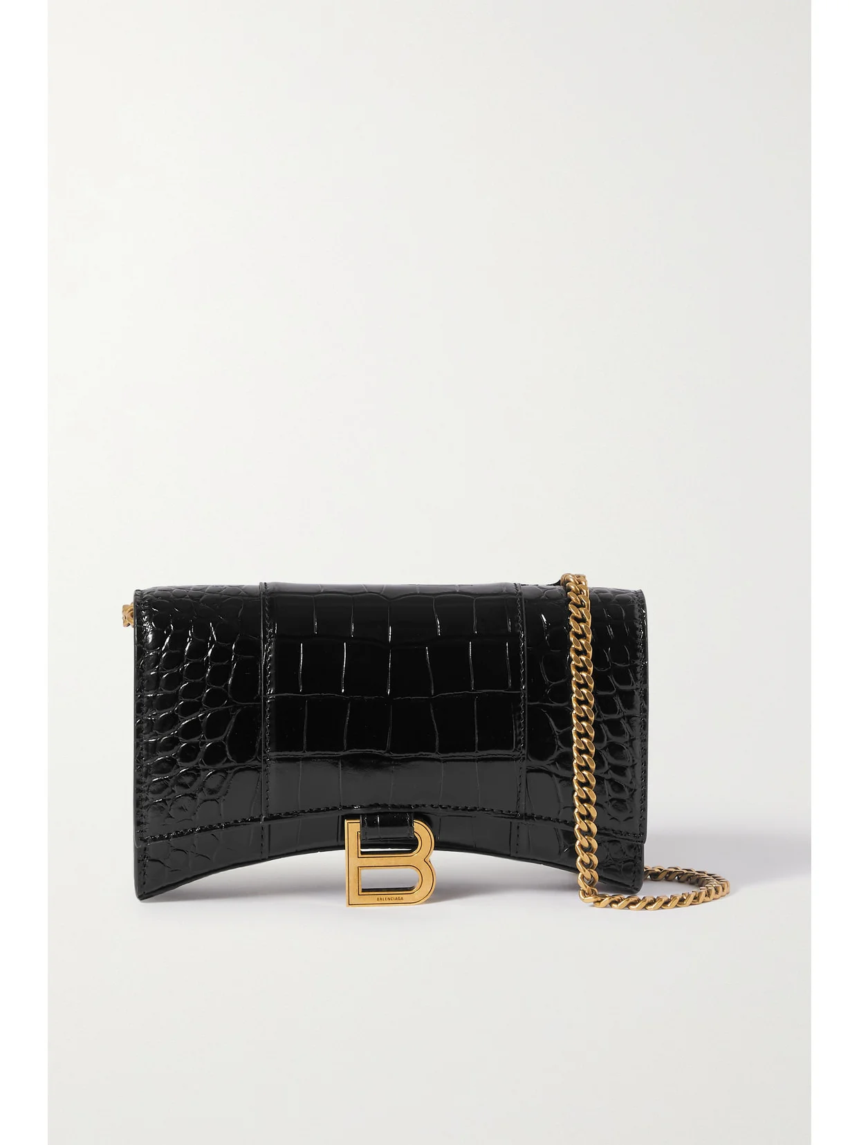 Balenciaga's 'Hourglass' bags are inspired by the label's sculptural blazers. This version bag has been crafted in Italy from croc-effect leather and detailed with a brushed gold 'B' at the front flap. The interior has multiple card slots, a zipped compartment and a handy pocket for your phone or keys. It's perfectly sized to fit your cardholder and lip gloss.