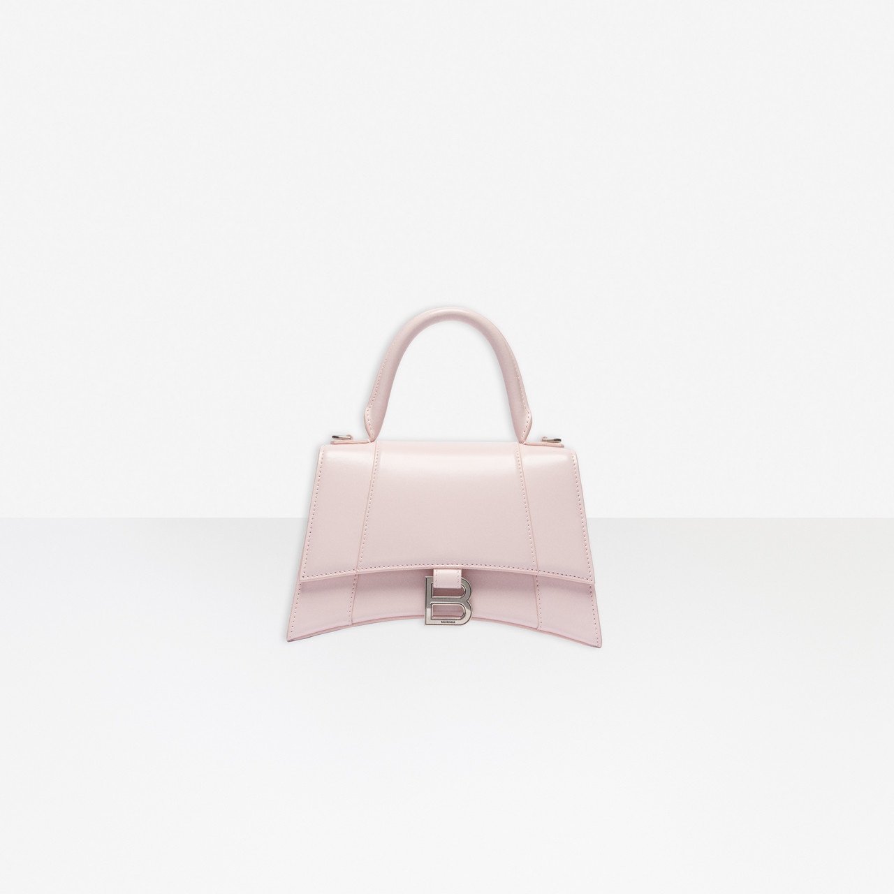 Hourglass Small Top Handle Bag in light pink shiny box calfskin PRODUCT DETAILS Dimensions: W 8.8 inches H 6.2 inches D 3.9 inches Composition: 100% Calfskin - Shiny box calfskin - Hourglass shape - Curvilinear base - Long flap - Adjustable and removable crossbody strap (55 cm) - 1 handle - Magnet closure with aged-silver B logo (brass) - 1 back pocket - 1 inner patch pocket - 1 inner zipped pocket - Nappa lambskin lining - Made in Italy - Wipe with a soft cloth - The item comes with a Balenciaga dustbag