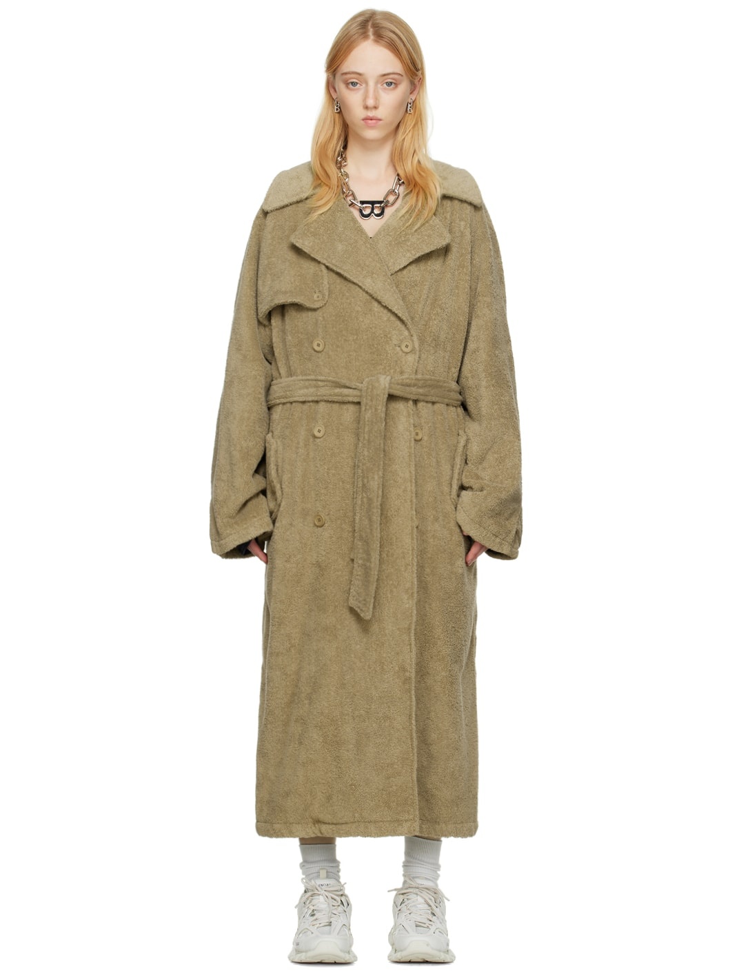 Cotton terrycloth trench coat. · Notched lapel · Double-breasted button closure · Storm flap at front and back · Belt loops and detachable belt · Flap pockets · Raglan sleeves · Adjustable button tab at cuffs · Central vent at back hem · Full satin lining Supplier color: Dune Body: 100% cotton. Lining: 100% viscose.