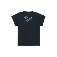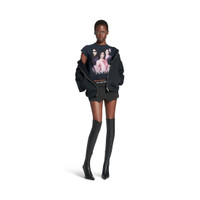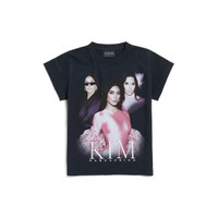 Kim K Shrunk T-Shirt in faded black stretch peeling jersey PRODUCT DETAILS • Peeling stretch jersey • Crewneck • Ultra short sleeves • Kim K artwork printed at front and autograph printed at back • Balenciaga logo embroidered on left sleeve • Made in Portugal Main material: 100% cotton