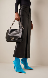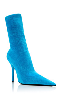 Experimental and minimalistic by design, Balenciaga is also renowned for its uncompromising standard and avant-garde creativity. With Creative Director Georgian designer Demna Gvasalia at its helm, the brand continues to live and breathe Balenciaga’s inherent elegance, balanced with the designer’s edgy, urban aesthetic. Designed to lengthen your legs, Balenciaga's booties have sharply pointed toes that resemble a knife. This iteration is covered with a stretchy technical knit with a velvety soft touch. Style yours to add a pop of color to an all-black look. PRODUCT DETAILS - Heel height measures approximately 100mm / 4.5" - Slip on - Composition: fluid velvet jersey - Designer color: Azure - Made in Italy