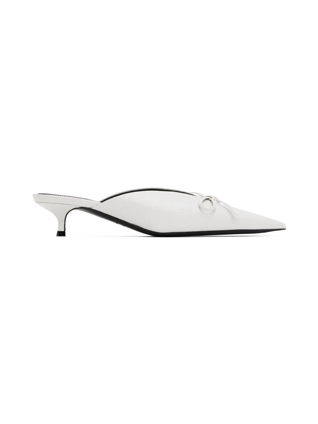 Crinkled lambskin slip-on mules in white. · Pointed toe · Box applique at vamp · Logo embossed and grained leather footbed · Grained leather lining · Covered kitten heel with rubber injection · Polished leather sole · Heel: H1.75" Supplier color: White Upper: lambskin. Sole: leather. Made in Italy 242342F122000