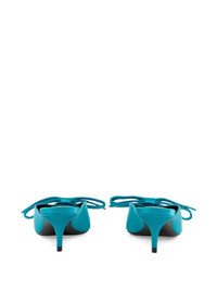 65mm Nano Bow heeled mules Highlights - Turquoise blue - Satin finish - Pointed toe - Kitten heel - Nano bow embellishment - Slip-on style Made in Italy Composition Outer: Viscose 72%, Mulberry Silk 28% Sole: Fabric 100% Lining: Fabric 100% SIZE & FIT Measurement HEEL 2.55 in(6.5 cm)