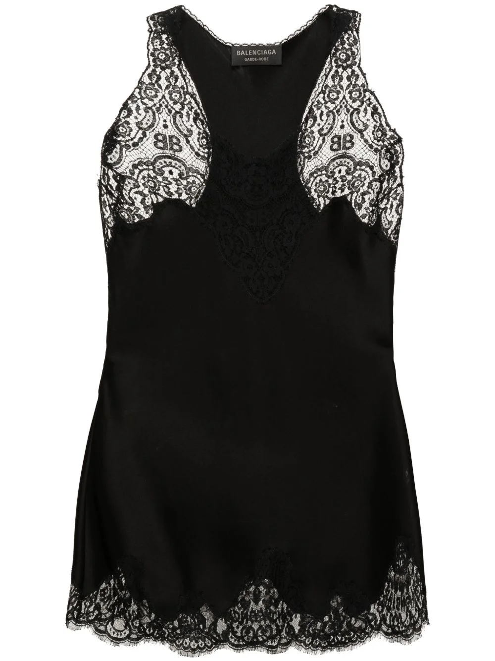 lace-trim tank top Crafted from a fluid silk blend, this top by Balenciaga showcases delicate lace trims at the V-neck and hem. Highlights - Black - Satin finish - Lace trim - V-neck - Sleeveless - Racerback - Scallop hem Made in Italy Composition Acetate 80%, Cotton 75%, Polyamide 25%, Polyester 20% SIZE & FIT Model measurements Height 5 ft 11 in(1.8 m) Bust/Chest 31.49 in(80 cm) Hips 35.82 in(91 cm) Waist 24.8 in(63 cm) Measurement LENGTH 25.98 in(66 cm) WAIST 39.01 in(99.1 cm) BUST 35.98 in(91.4 cm) FittingInformation Designed for a relaxed fit, this piece allows for comfort and movement when worn Made from a lightweight non-stretch fabric This piece fits true to size – take your usual size Washing instructions Dry Clean Only