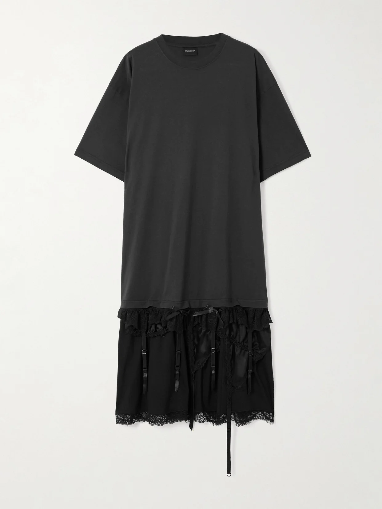 Inspired by lingerie, Balenciaga's T-shirt dress is detailed with a suspender belt complete with silk-satin bows and a stretch-modal lace-trimmed slip. It's made from soft cotton-jersey and has a relaxed shape with a classic crew neckline. Style yours with heels or sneakers.