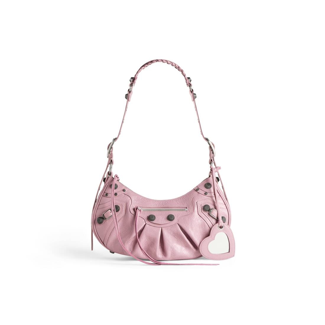 Le Cagole Small Shoulder Bag in pink Arena lambskin, aged-silver hardware PRODUCT DETAILS • Dimensions: L13 x H6,3 x W3,3 inch • Arena lambskin • Shoulder bag • Adjustable shoulder strap (19,3 inch) • Leather braided shoulder pad • Zipped closure with knotted leather puller • Front zipped pocket with knotted leather puller • Aged-silver hardware • 1 removable heart mirror • Tone-on-tone Balenciaga logo embossed on mirror • 1 zipped back pocket with knotted leather puller • 1 inner zipped pocket • Cotton canvas lining • Made in Italy • Wipe with a soft cloth Material: 100% lambskin