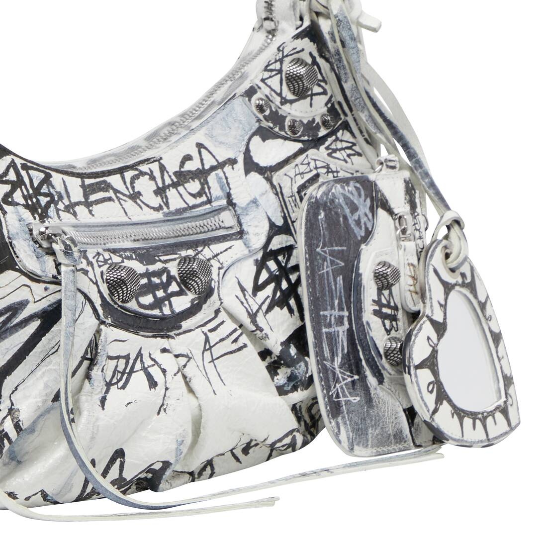 Le Cagole Small Shoulder Bag in white and black Graffiti printed Arena lambskin, aged-silver hardware PRODUCT DETAILS • Dimensions: L13 x H6,3 x W3,3 inch • Graffiti printed Arena lambskin • Shoulder bag • Adjustable shoulder strap (18,1 inch) • Leather braided shoulder pad • Zipped closure with knotted leather puller • Aged-silver hardware • 1 removable zipped pouch • 1 removable heart mirror • Tone-on-tone Balenciaga logo embossed on mirror • Cotton canvas lining • Made in Italy • Wipe with a soft cloth Material: 100% lambskin