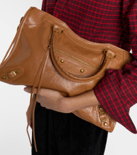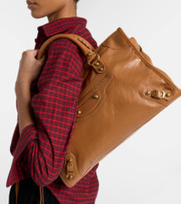 Balenciaga revisits an iconic silhouette with the Le City Medium tote bag. Crafted from supple leather, this spacious design features signature studded detailing, a detachable strap, and various zipped pockets. Product Details - Material: lamb leather - Lining: fabric - Made in Italy - Color: brown - Designer color name: Camel - Hardware color: gold - Trim: leather - Top handles, Detachable shoulder strap - Internal details: internal zipped pocket - Zipped front pocket - Closure: zipped top - Includes: dust bag - Item number: P01121153 Size & Fit - Height 23,5cm-9.5" - Width 38,5cm-15" - Depth 13cm-5" - Length of handles 39cm-15.5" - Adjustable shoulder strap - Min. length shoulder strap 83cm-32.5" - Max. length shoulder strap 109cm-43"
